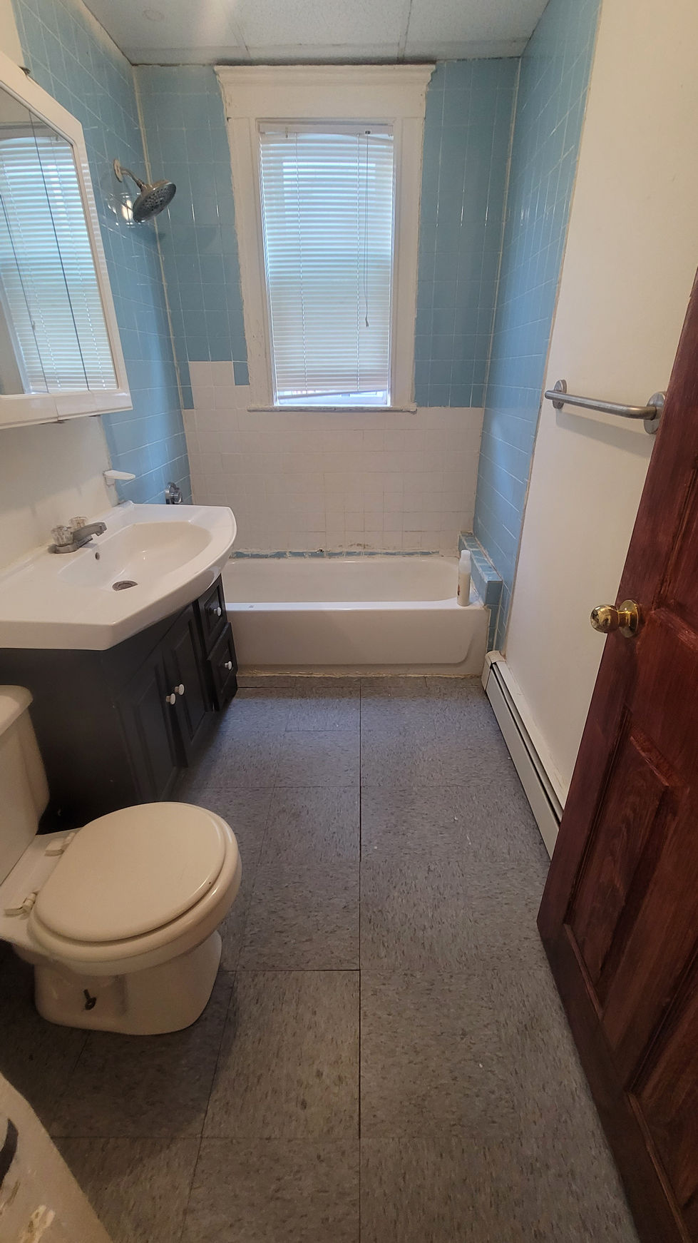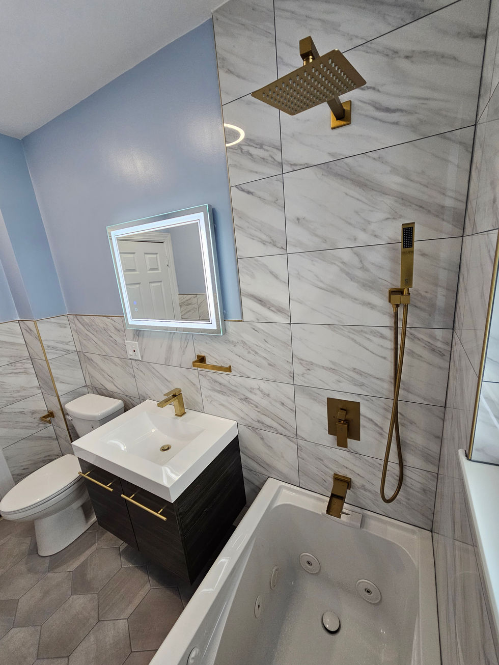 The former bathroom has been entirely renovated into a sophisticated, modern space designed to accommodate family needs. Featuring refined gold fixtures, a luxurious jacuzzi tub, and intricately arranged tiles that evoke the tranquility of the sea, this space offers an unparalleled opportunity to unwind. Upon entry, one is enveloped in an atmosphere of serenity, providing a haven to recharge.